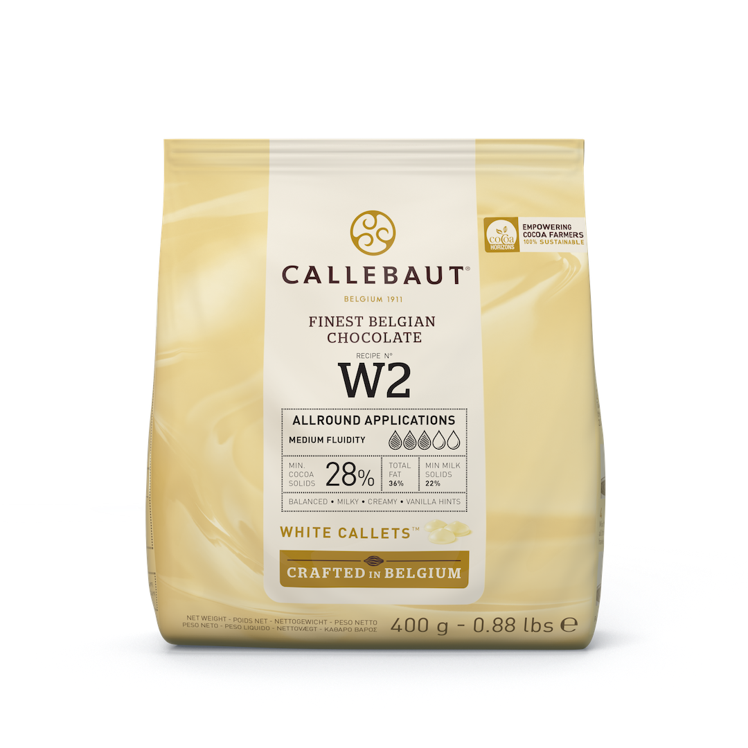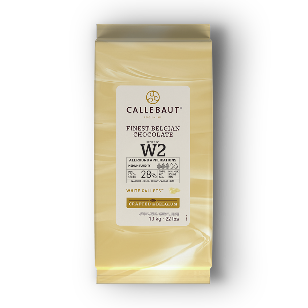 The iconic Callebaut W2 white chocolate is one of Callebaut’s original recipes that has grown into the preferred chocolate for chefs. Boasting a delightful taste with pronounced creamy, caramelly and vanilla notes, W2 can be paired with a wide range of ingredients and flavours. With medium fluidity, this an ideal all-round chocolate to be used in chocolate bars, mousses, crèmes, and sauces.  Cocao Solids: 28%