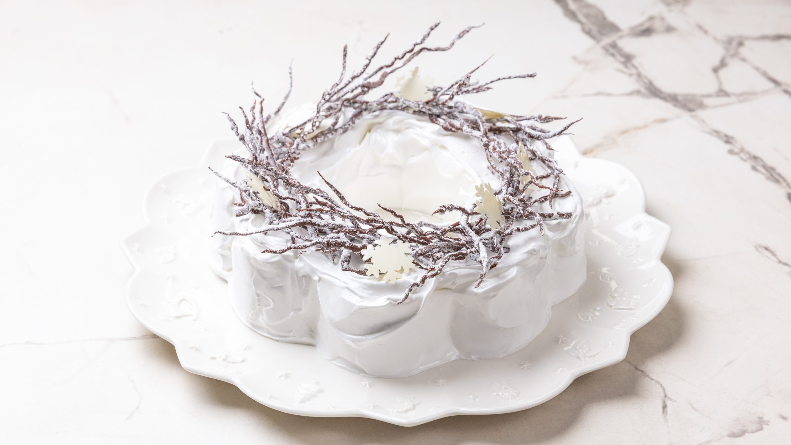 Fluffy vanilla cupcakes filled with a candied fruit and roasted almond–studded custard cream, arranged into a festive wreath and coated in silky Swiss meringue. The wreath gets the full winter-wonderland treatment with icing-sugar-dusted chocolate twigs and delicate white chocolate snowflakes.