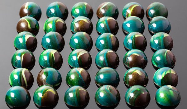 Chocolate does not like liquid, so when colouring chocolate, always use an oil-soluble powder. Steer clear of any water-based products as they tend to make chocolate thicken and go lumpy. Similarly, oil-liquid colours reduce the chocolates’ ability to contract, so you can say goodbye to getting a great shine if you decide to use these.